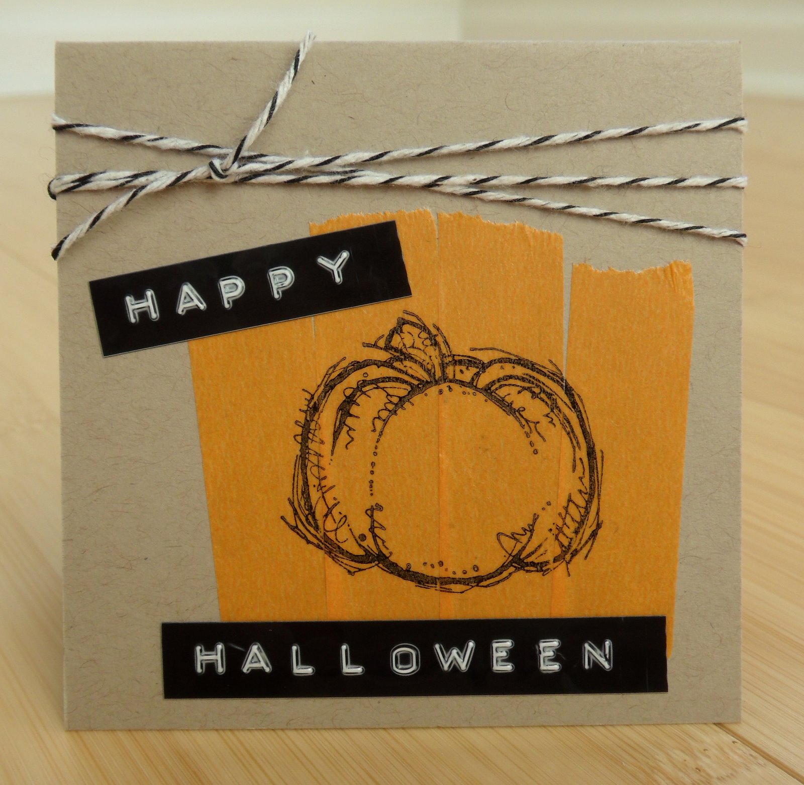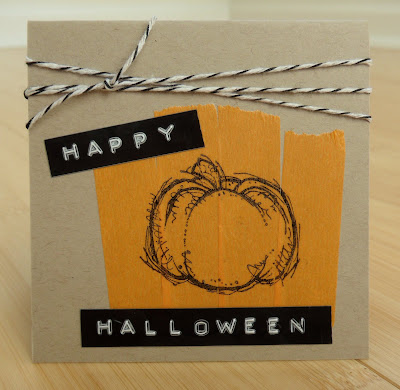 this one's just a little guy...3" by 3"...did a little pumpkin stamp on some washi tape...pretty sure it's stampin' up...then with my dymo label maker...did the happy halloween...topped it off with some black and white baker's twine...